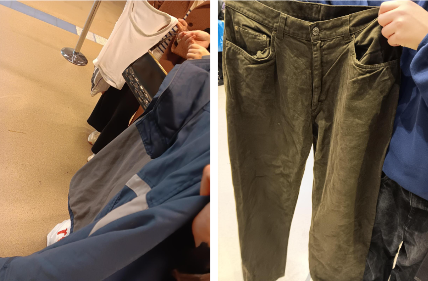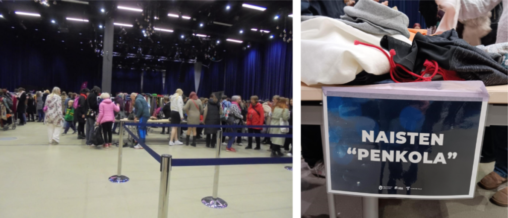 Vaatteidenvaihtoalueella soi musiikki. Kaikkialla on rekkejä täynnä ihmisten antamia käytettyjä vaatteita ja asusteita. Tunnelmaa voisi luonnehtia rennoksi, ellei väkeä olisi niin valtavasti. Kaikkialla puikkelehtii ihmisiä, ja työntekijät juoksevat hiki hatussa hakemaan lisää tuotuja vaatteita rekkeihin laitettaviksi sitä mukaa, kun edellisiä päätyy sovitukseen. Väentungoksesta huolimatta kävijöillä näyttää olevan hauskaa. Iloinen puheensorina, nauru ja löytämisen riemu täyttävät koko tilan.