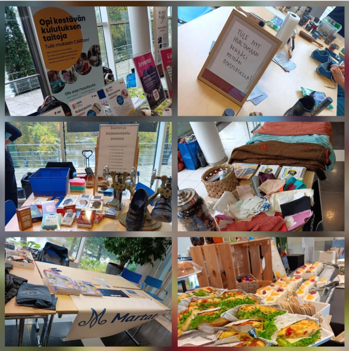 Vaihdettavien vaatteiden ja asusteiden lisäksi tapahtumasta löytyy useita oheispisteitä, joiden pyörittäjiä olen käynyt yksitellen haastattelemassa. Käytävän varrella ensimmäisenä on Ekokumppaneiden piste, jossa esitellään vinkkejä nukanpoistoon ja helppoon vaatteidenhuoltoon. Lisäksi pisteellä on arvonta. Ekokumppaneiden pisteen jälkeen on Sustinaren piste, jossa kävijät saavat itse kokeilla omien kenkiensä ja muiden nahkatuotteidensa huoltoa. Sen jälkeen vuorossa on Annen Suutarin piste, jossa annetaan kävijöille tietoa, siitä, mitä kaikkea kengille ja vaatteille voidaan tehdä, jotta ne saadaan jälleen hyvännäköisiksi ja käyttökelpoisiksi. Opin, että kenkiä voidaan myös venyttää.